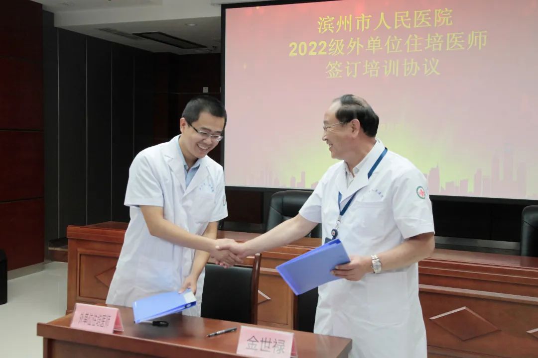 金世禄副院长代表医院与社会化住培医师代表相均、外单位住培医师代表宋文哲签订培训协议。